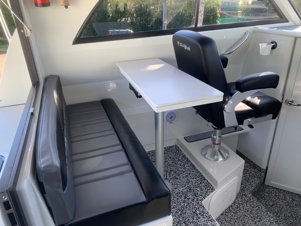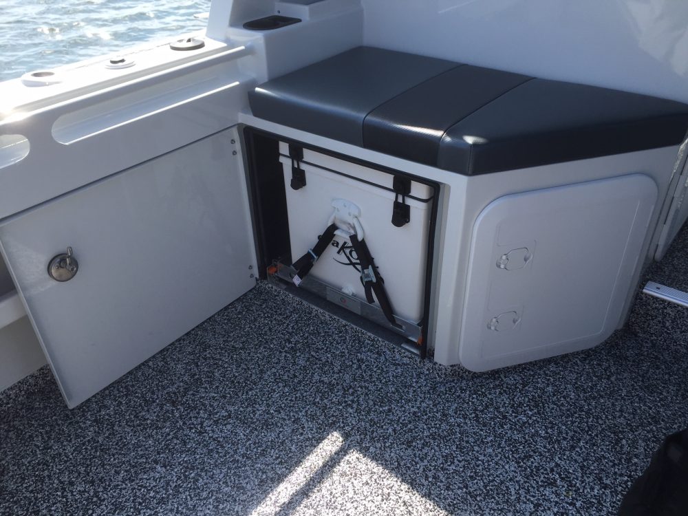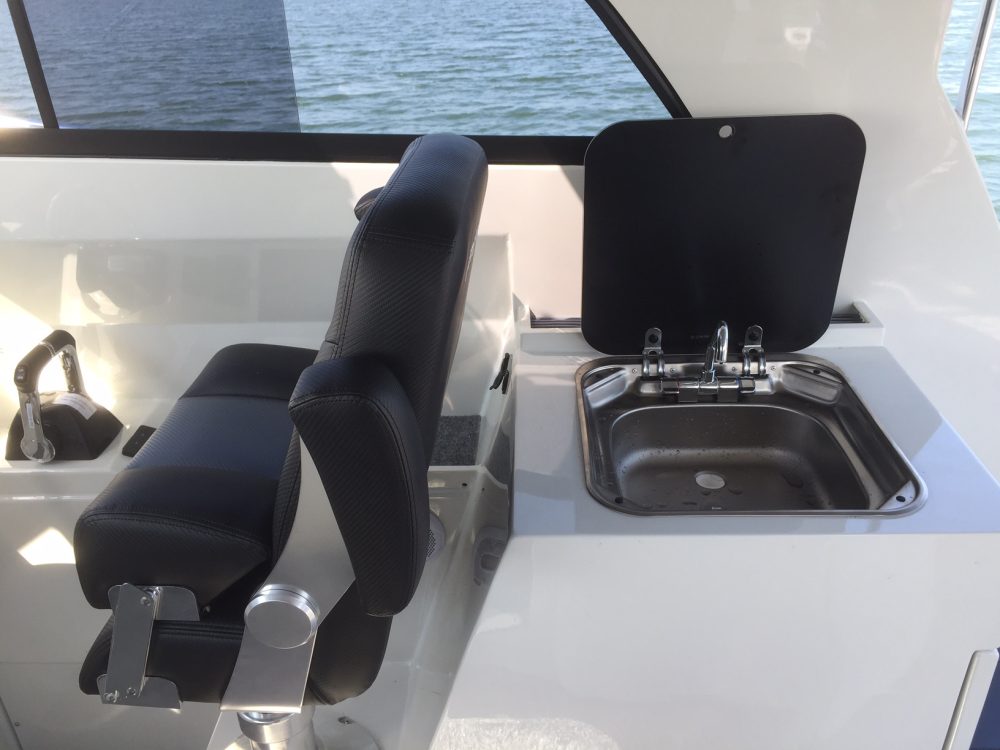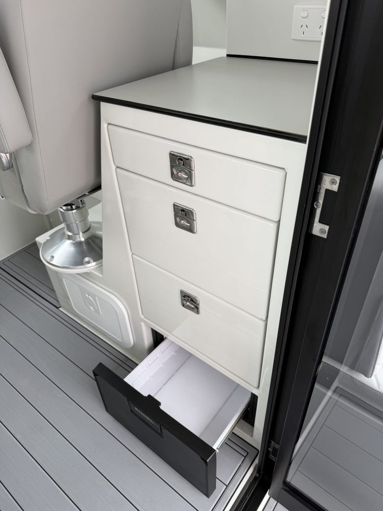 - Corian bench behind starboard helm seat with 60 litre S/S fridge under, small drawer above & pie oven on shelf above bench