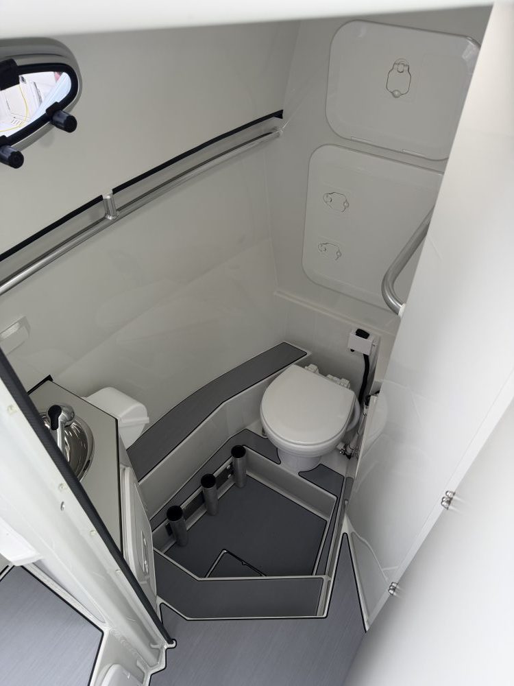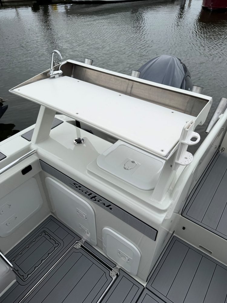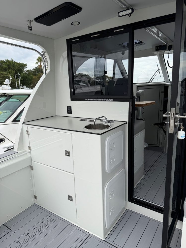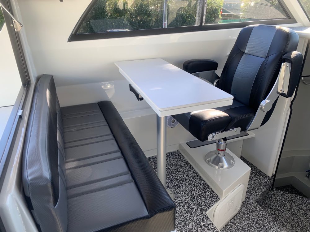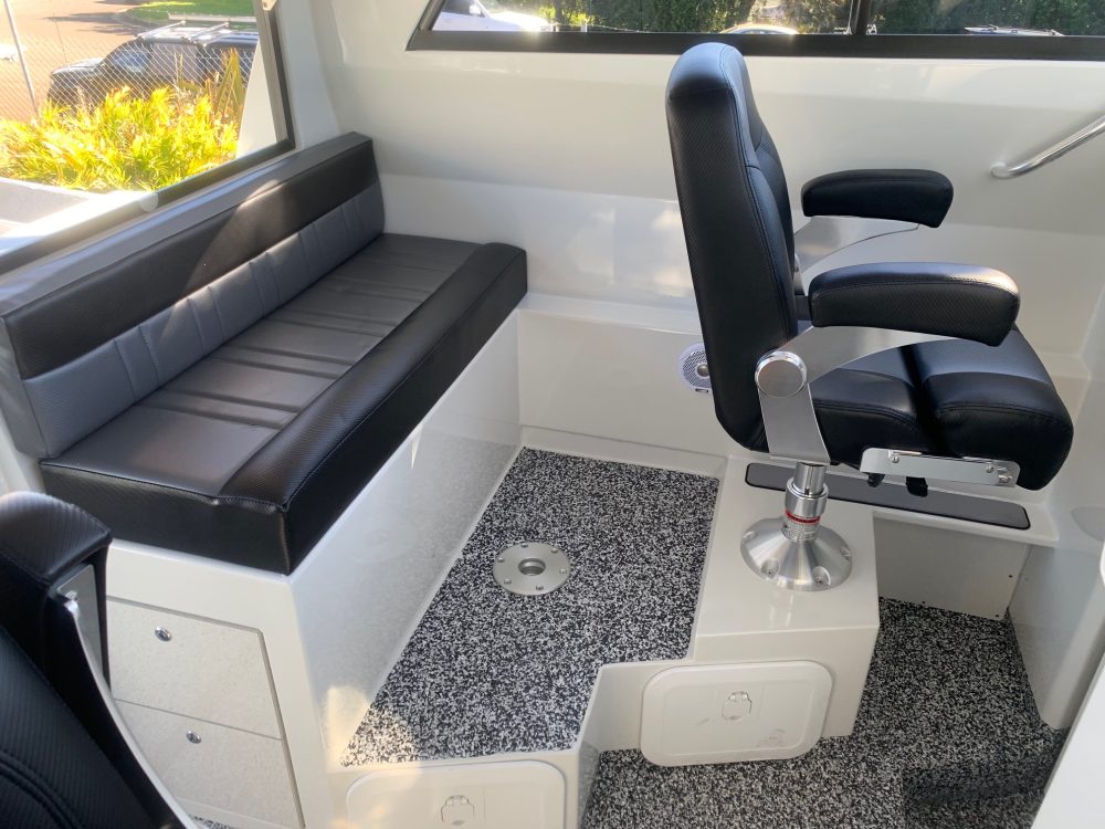 - Corian bench behind starboard helm seat with 60 litre S/S fridge under, small drawer above & pie oven on shelf above bench